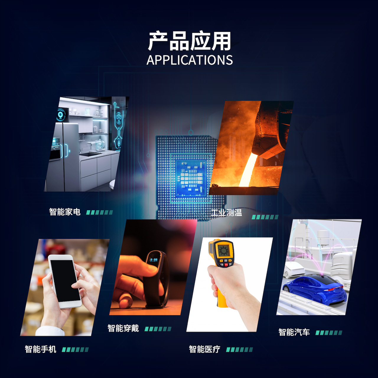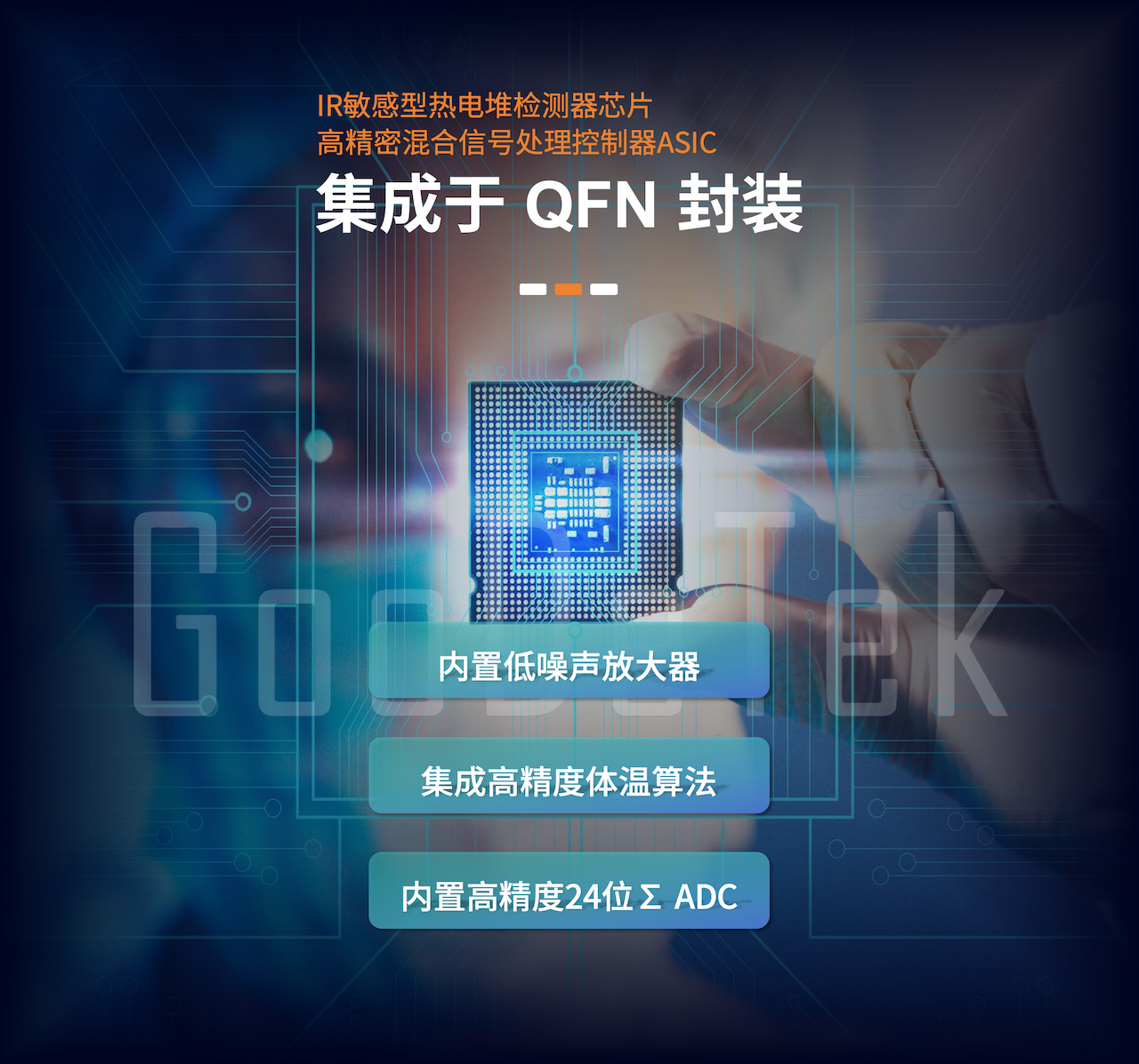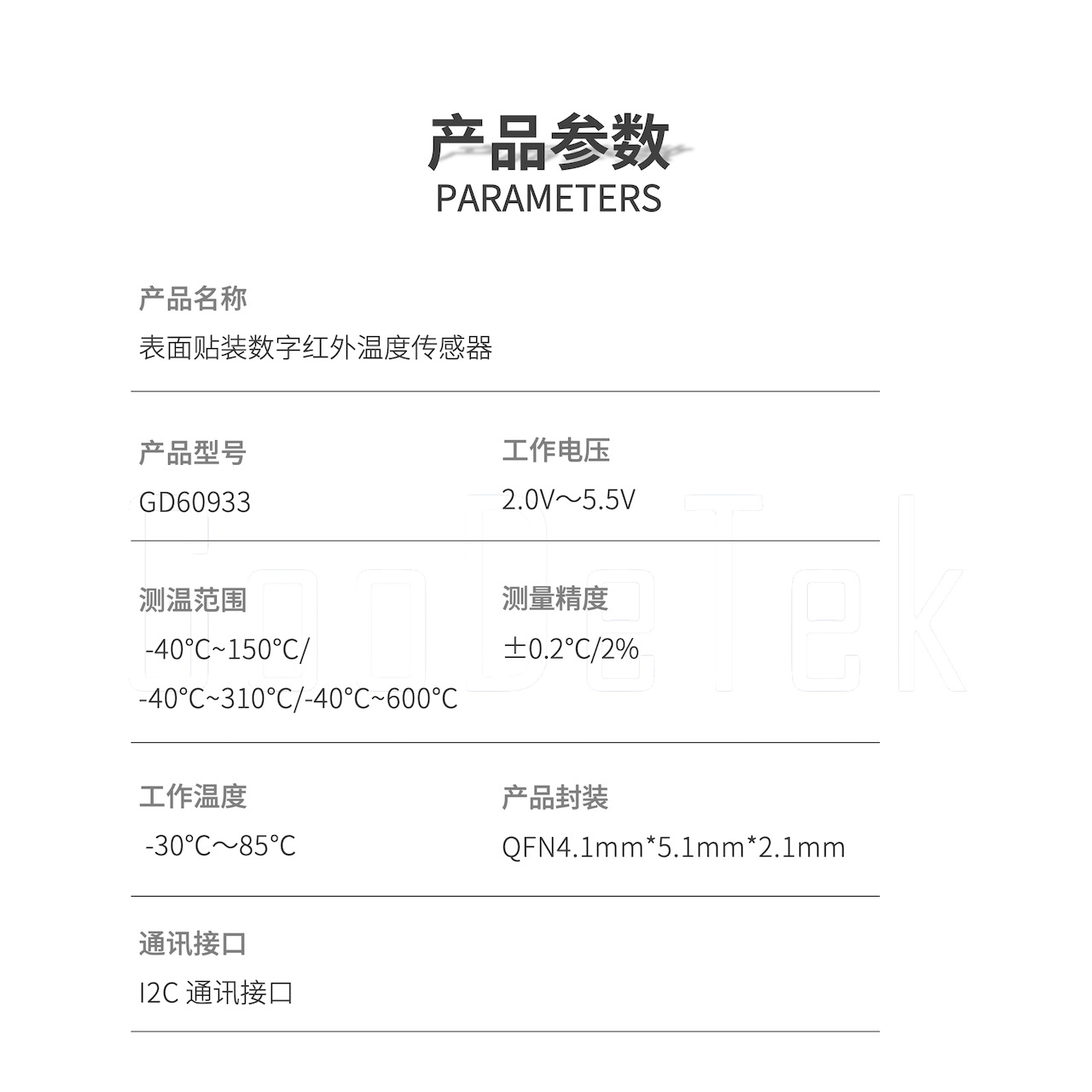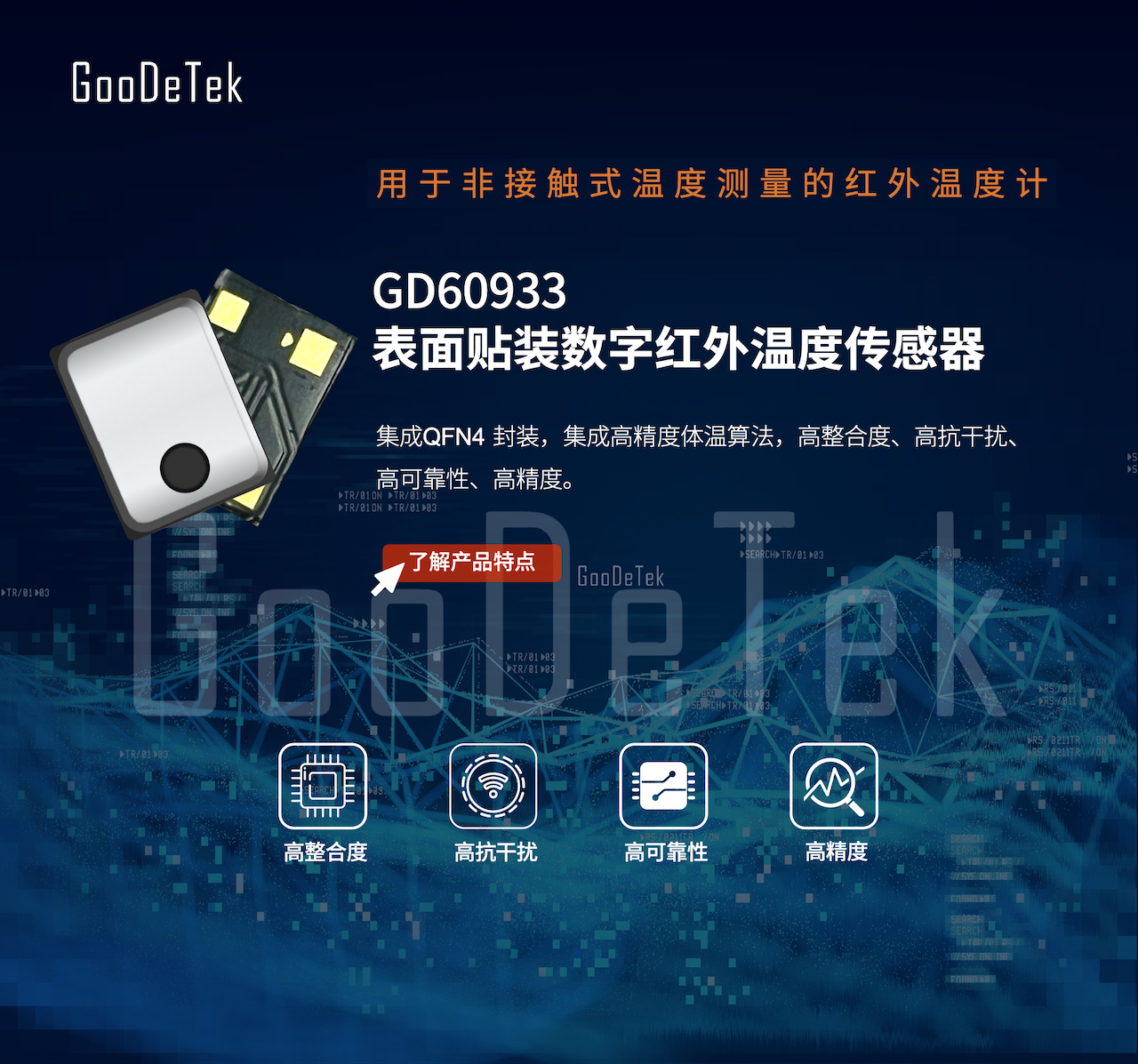 GD60933红外温度测量传感器芯片是一款用于非接触式温度测量的红外温度计,IR 敏感型热电堆检测器芯片和高精密混合信号处理控制器 ASIC 都集成在DFN封装中,内置低噪声放大器及高精度24位Σ ADC ,同时集成了高精度体温算法,具有高整合度、高抗干扰、高可靠性、高精度的特点。
